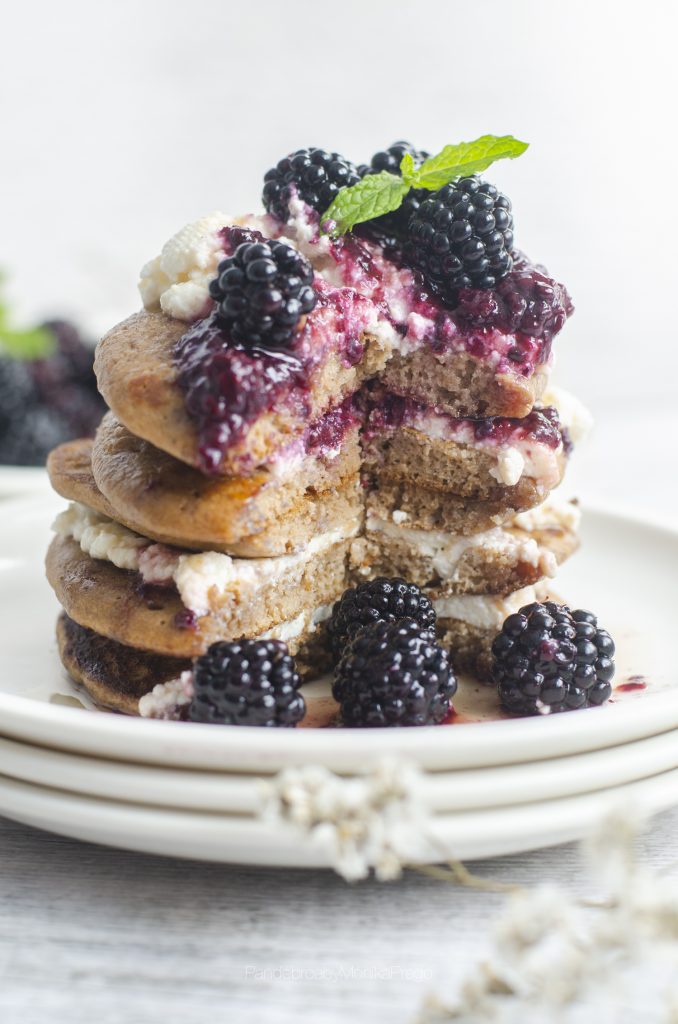Tortitas de avena esponjosas con cacao y moras.