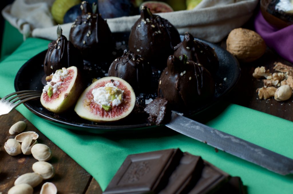 Higos rellenos de queso y pistachos bañados con chocolate intenso