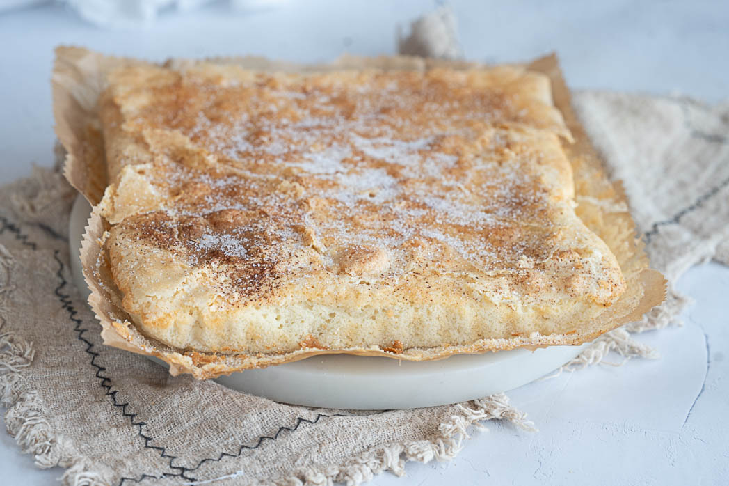 Vertemos la masa en un molde cuadrado forrado con papel vegetal. Espolvoreamos por encima los 50 g de azúcar restantes para formar la costra característica. -