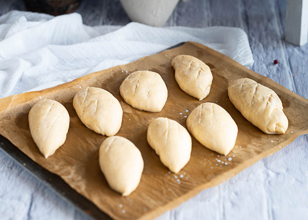 Desgasifica ligeramente la masa y divídela en 24 porciones iguales. Forma primero bolitas, dándoles un poco de tensión en la superficie. Para darles forma de pulguita, estira ligeramente cada bolita y enrolla la parte superior hacia ti, apretando suavemente para generar tensión. A medida que enrollas, ve formando un pequeño rulo. Finalmente, hazlo rodar sobre la mesa con las palmas para afinar los extremos y conseguir esa forma alargada y característica.