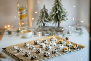 Formamos bolitas con la masa y las pasamos primero por azúcar blanco y después por azúcar glas varias veces para conseguir el efecto craquelado.