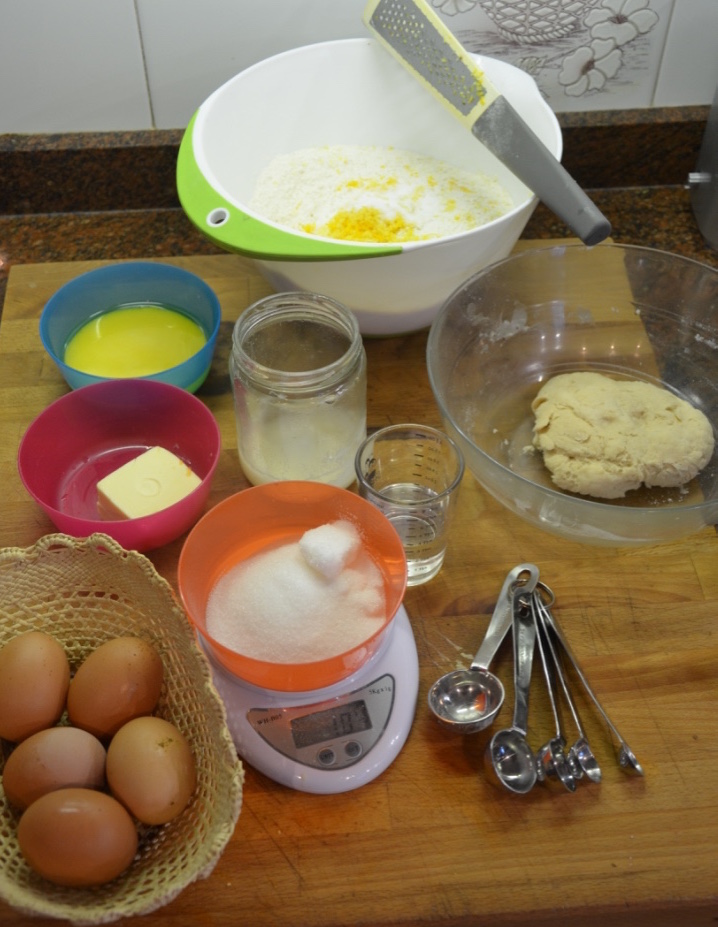 Sacamos el fermento de la nevera, la manteca, mantequilla y los huevos, para que se vayan atemperando. Pesamos la harina y le añadimos la ralladura de limón, naranja y la sal.